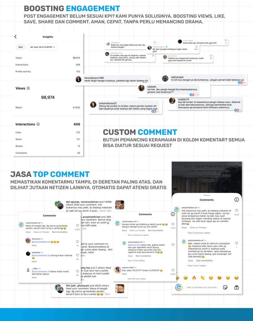 Lebih dari 6 tahun kami membantu berbagai bisnis, publik figur, dan brand dalam membangun engagement di media sosial. Bukan dari bot, bukan pakai akun yang usernamenya penuh angka acak, tapi dari manusia yang benar-benar berinteraksi. Itulah kenapa Solusimedsos.id menjadi PUSAT ENGAGEMENT ORGANIK.
